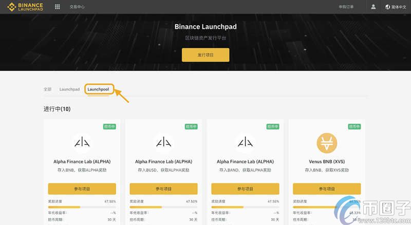 2.单击【Launchpool】菜单,即可找到【新币挖矿】的全部项目。