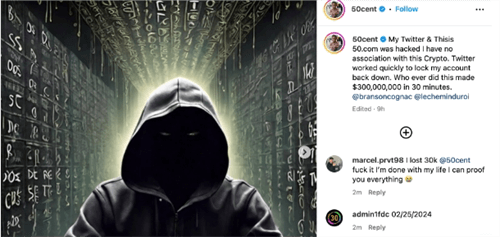 50 Cent通过其拥有3280万粉丝的Instagram账户发布声明,确认了他的X账户和官网遭到黑客攻击,并指出已有大量资金从相关项目中流失。他透露:“Twitter迅速锁定了我的账户。不管是谁做的,他在30分钟内就赚了3亿美元。”同时,他强调自己“与这种加密货币没有任何关系”。