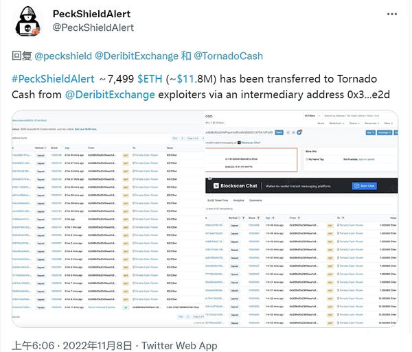 11月8日消息,据派盾监测数据显示,Deribit热钱包攻击事件黑客已累计将7499枚ETH(约合1180万美元)通过中间地址(0x3...e2d)转入Tornado Cash。