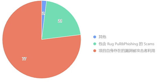 在这些安全事件中,约 77% (144 起)源于项目自身存在漏洞被攻击者利用,损失金额约 18.4 亿美元,占安全事件总损失的 93%;约 21%(39 起) 源于包含 Phishing&Rug Pull 的 Scams,损失金额约 1.3 亿美元,占安全事件总损失的 6%。