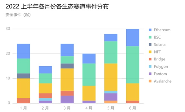 尽管 2022 年区块链技术正在飞速发展并且逐渐完善,但层出不穷的加密货币攻击事件对区块链生态安全态势提出了新的挑战。从统计数据来看,上半年发生安全事件次数较多的月份主要在 5、6 月;从各生态来看,BSC 上安全事件发生最多;从赛道来看,损失最多的是跨链桥。