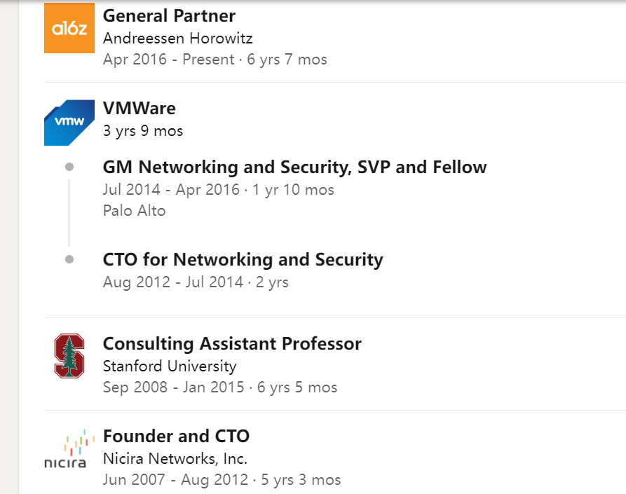 以下是 Martin Casado 的大致经历,在 Nicira 创业之前,他是斯坦福的 PHD,笔者会经常 Track 一些学术 + 创业背景都有的投资人的动向(比如说他们投了什么新鲜玩意?为什么?他们社交网络会发什么研究文章?),因此偶尔会发现一些值得观察的方向。