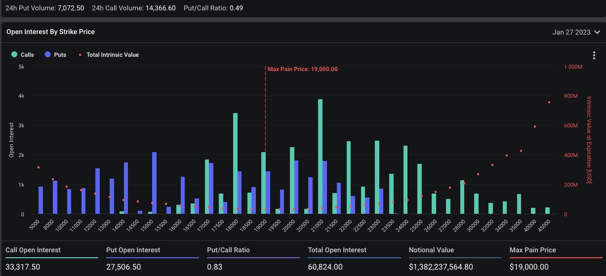 逾13.8亿美元的BTC和7.5亿美元的ETH期权1/27到期目前比特币走势仍难以判断,但据Deribit数据,本周有大量期权合约将在1月27日到期,届时将有超过60,820张,名义价值逾13.8亿美元的BTC期权合约到期。最大痛点价格为$19,000美元,历史数据来看卖方会尽力将价格压到这附近,以求效益最大化。