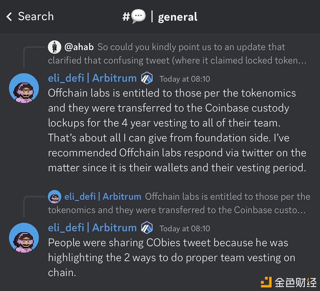 Offchain Labs团队与Future团队及顾问的26.94亿枚ARB转入140个EOA地址,Arbitrum DAO社区的eli回复这些代币是转移至CoinBase的托管账户,旨在采用CoinBase的托管解锁服务。此外,eli已经建议Offchain Labs团队通过官方推特澄清此事。